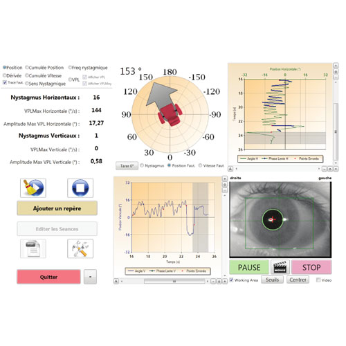 • FramiVNG video-nystagmography software for analysis (VPL, Gain…) of spontaneous nystagmus, post HST, per/post rotatory movements in NIR and BURST, caloric tests, and oculomotor skills. Software compatible with Frami-Chair and its Computerization Kit.